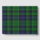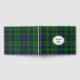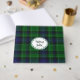 Plaid wedding guest book done in the classic Scottish green, blue, white and black Abercrombie clan tartan plaid pattern. A white decorative oval text area, on the front of the book, has custom text ready to personalise for your wedding.