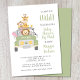 Cute baby shower by mail invitation featuring an illustration of baby zoo animals (lion, elephant, zebra, monkey and giraffe) piled into a safari vehicle, "It's About to Get Wild" in fun typography and "Baby Shower" and the name of the mother in a jungle green script. Easily personalise the shower by mail details, change the "It’s a Boy!" text on the vehicle, and add the due date on the license plate, or leave blank.