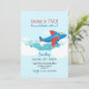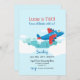 A juvenile invitation, to a boy's birthday celebration, featuring a red and blue aeroplane flying high above the clouds. (<a href='https://www.freepik.com/free-vector/colourful-travel-banners-with-flat-design_2354152.htm'>Designed by Freepik</a>). (<a href="https://www.freepik.com/free-vector/set-of-white-clouds_979612.htm">Designed by Freepik</a>). <br/><br/>The card is easy to customise with your wording, font and font colour.<br/><br/>Not exactly what you're looking for? All our products can be custom designed to meet your needs at no extra charge.<br/><br/>Simply contact us at askcottonlamb@gmail.com.<br/><br/>Coordinating products available: Just ask us!