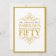 Let everyone know that the fabulous woman in your life is turning fifty with this fiftieth birthday party invitation in gold and white. The elegantly framed text on both front and back is accented with swirls and flourishes in gold and set against a crisp white background and a subtly patterned matching colour border. All text on the back can be customised to suit your needs. Also available in a variety of colours and ages.