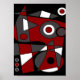Abstract #185 is a digital abstract design incorporating geometric shapes and colour fills, including reds, white and grey, on a black background by Ron Trickett