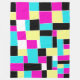 An original abstract design made up of irregular rectangles and squares in pink, yellow, cyan blue, and black.