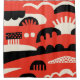 A bold original hand drawn abstract design in black, orange red, and cream.