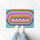 This doormat has a geometric design of concentric half-circles of several retro colours.