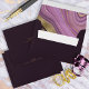 You get both glamour and high impact with this coordinating wedding set that features abstract agate patterns, textured with faux-crystals and highlights in glittering faux gold foil. Striking colour combinations, like this suite with it's luxe palette from muted grape and mauve to soft orchid pink, create the background for the pieces in this coordinated collection. This matching envelope features the above described abstract interior and an optional dark grape exterior. A template is provided to easily add your names and address. View the collection link on this page to see all of the matching items in this beautiful design or search ID827 to see additional colour choices for this design.