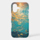 The image shows water with ripples and golden reflections. The water is a mix of turquoise and dark blue, with concentric circles forming from the ripples. Golden light reflects on the surface, creating a shimmering effect. The overall mood is serene and calming, with a focus on the beauty of natural light and water movement. The reflections add depth and complexity to the scene.