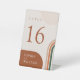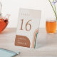 Modern boho wedding table numbers with arch shapes in terracotta, rust, burnt orange, and dark green, emerald tones.