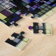 Abstract Architecture City Scape Blues puzzle features an abstract design of modern buildings with lots of angles against a background with more vertical and horizontal lines. Mostly shades of blue with some purple, yellow, and green.