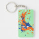 A stylish keyring with design of abstract expressionism art paint splash with colours of orange and blue against a mint green background. Arty and funky, this design is colourful and vivid.
