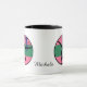 Perfect for the gymnastics girl, this mug features an abstract graphic rendering of a gymnast in a hand stand pose. The circle image is in black, teal green, and pink, with your name or other custom text in black in the centre. The image is repeated on the opposite side of the mug. *Clip art used in this design is copyrighted by Encore Software, Inc., which permits use to its licensors. All rights reserved.