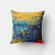 This outdoor pillow features an abstract paint splatter texture pattern in a colour scheme inspired by summer holidays at the beach. The colours include sky and ocean blues, sandy sunshine yellows, and lobster reds.