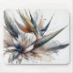A delicate composition features an abstract bird of paradise flower in muted blue, green, and orange tones