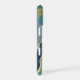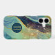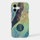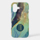 This is a stunning phone case that features a dark and light blue agate and marble style background with a gold star shine overlay. At the centre bottom is your monogram in gold on a gold lined matching blue circle banner. Elegant!