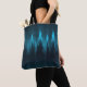 Tall, abstract blue and black spires or towers emerging from a dark, misty background tote bag