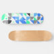 This cool skateboard features abstract geometric design with lines and shapes in black, blue and green shades on white.