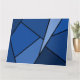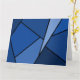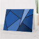 Inspired by stained glass, this stylish geometric design contains polygons in various shades of blue outlined in black. A light blue triangle slashes in from the upper right with an array of progressively darker blue quadrangles and other shapes spiralling around it from light to dark. Two dark blue shapes ground the left side of the original design.