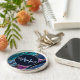 This elegant key chain features a dark blue circle banner with your monogram in lighter blue at the centre, and your name in silver script over it. The banner is placed on an elegant multi colour agate style background with gold faux glitter threaded through out. Beautiful!