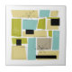 This funky mid-century modern ceramic tile features aqua blue, avocado green, yellow, and tan abstract rectangles, along with highlights of black and white starbursts. Add a pop of retro fun to your home decor!