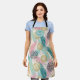 This seamless abstract pattern apron features broad, expressive brushstrokes in soft shades of teal, pink, and light blue over a light cream background. Scattered throughout the design are clusters of dots—some solid in deep blue or black, others shimmering in gold with textured, net-like detailing. Additional gold specks and larger golden dots bring a touch of elegance and dynamic visual interest. The result is a modern, artistic composition that’s both vibrant and refined.