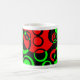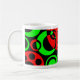 An exciting and fun abstract design made up of circular bubble like shapes in vibrant contrasting red and green with black.