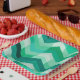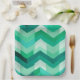 A vibrant abstract piece featuring a chevron pattern in sea green, feldgrau, mint, and turquoise hues, evoking a playful and whimsical atmosphere reminiscent of children's art.