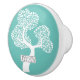 Abstract circle tree and name on light teal Ceramic Knob . A modern ceramic knob with a white tree made of circles.