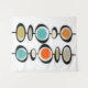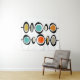 This fabulous mid century modern tapestry features two sets of abstract hanging circles in the colours of turquoise blue, two shades of orange, cream, avocado green, gold, and black. This will make a bold statement in your home decor!