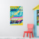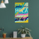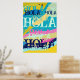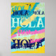 Hola text repeated in a colorful palette of blue, yellow, pink, turquoise and green.