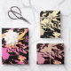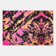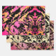 These wrapping paper sheets have an abstract pattern with different colors. One sheet has a pink orange color theme, another has a yellow golden color theme, and the third one has a orange redish-pink color theme.