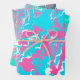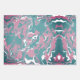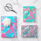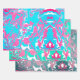 These wrapping paper sheets have an abstract pattern with different colors. One sheet has a white blue pink color theme, another has a teal white pink color theme, and the third one has a dark blue redish-pink color theme.