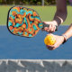 A fun and unique pickleball paddle that won't look like everyone else's! An abstract design of orange, gold and bright blue on a black background. The design is on both sides of the paddle. Stand out on the court!
