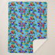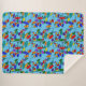 Colourful abstract circles sherpa fleece blanket. Background colour is bright blue.