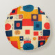 Vibrant and playful pattern composed of various geometric shapes and organic forms. The background is a warm, cream-like colour that contrasts with bold, navy blue, red, orange, and yellow shapes.