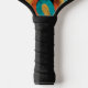 A fun and unique pickleball paddle that won't look like everyone else's! An abstract design of orange, gold and bright blue on a black background. The design is on both sides of the paddle. Stand out on the court!
