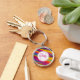Personalised round keychain features abstract art, a colourful rainbow gradient in bright yellow, orange, red, purple, blue, and green shades, and customisable name and monogram in the pink font on a white round frame.