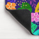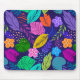 Abstract colourful tropical pattern design with leaves & flowers on dark purple background