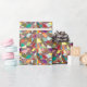 A confetti tapestry of colours form this abstract design. Background in silver purple glitter.