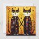 Abstract Companions: A Tale of Two Cats. This artwork features two feline companions in a radiant embrace. The geometric accents and golden hues evoke a sense of timeless beauty and unity. They are adorned with intricate geometric designs and symbolise harmony. Their piercing eyes and interlocked paws invite the viewer into a world where art meets emotion.