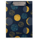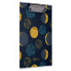 Fun abstract pattern of moon and stars on a dark blue background with printed gold foil accents.