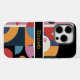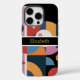 Custom Name Modern Abstract Geometric iPhone 16 Pro Cases features black, blue orange and red, pink watercolor geometric shapes with stripes and your personalised name in modern golden script. Personalise by editing the text in the text box below.