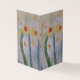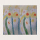 A host of colourful abstract spring daffodils sway in the breeze in a cottage garden. This charming watercolour floral design is a striking addition to any home. The vibrant yellow, orange and white petals contrast with the green leaves to create a delightful daffodils image.