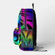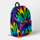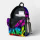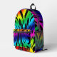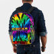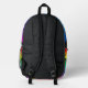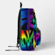 Wild abstract design in deep shades of a rainbow  plus more - reds, blues, yellows, greens, pinks, hints of purple, all accented with black.  The person who wears this backpack should definitely stand out in a crowd!