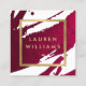 Deep, ruby red painted brushstrokes create an abstract backdrop on this designer square business card template. Your name or business name is displayed in a faux gold box on the front for a modern aesthetic. This double-sided card allows ample room on the backside for your contact info. A fun, eye-catching card for creative professionals. Art and design © 1201AM Design Studio | www.1201am.com