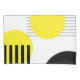 Abstract design illustration with geometrical (circles and stripes) shapes decoration in yellow and black colours on white background.