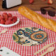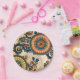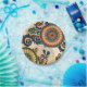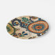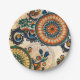 Abstract floral mandala paper plates in orange, blue, green, and ivory.