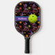 Be the envy of all the Pickleball ladies with this abstract floral pickleball paddle in black with brightly coloured abstract flowers, swirls, and circles in a variety of colours like green, pink, purple, blue, red, yellow, orange, and burgundy with a purple and blue band across the centre that has customisable wording on both sides. The front says, "Pickleball Princess" and the back is personalised with your name that sits beside a neon green pickleball that can be removed if you prefer. Email niteowlstudio@gmail.com with any request for changes.