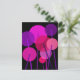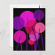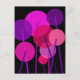 An abstract geometric modern art floral design of round flowers on stems in pink, purple and red colors against a black background.