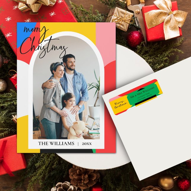 Celebrate the festive season with our Abstract Bold Colours Geometric Pattern Merry Christmas Card. Customise the card with your favourite photo to make it even more special and personal. This captivating card merges contemporary design with holiday cheer, making it a perfect choice for sending warm wishes to your loved ones. The abstract geometric pattern, featuring a lively blend of bold and vibrant colours, adds a modern twist to traditional holiday aesthetics. With its unique and eye-catching design, this card stands out and adds a touch of artistic elegance to your holiday greetings.