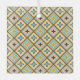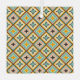 Abstract geometric pattern with diamond shapes in pastel colors. Each contains a star-like motif in teal, orange, or brown. Retro and symmetrical design.