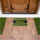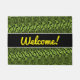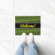 This door mat design features an abstract pattern with liquid-like splotch or blob shapes, coloured various shades of light and dark green. It also features the friendly message "Welcome!" on the front in yellow script-like text.